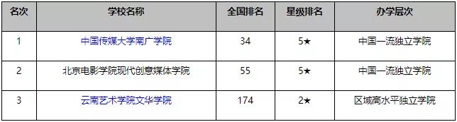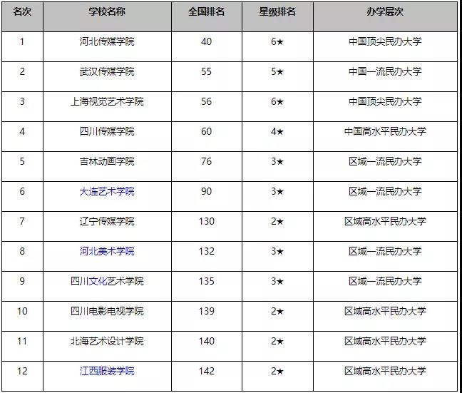 河北傳媒學(xué)院、武漢傳媒學(xué)院、上海視覺(jué)藝術(shù)學(xué)院、四川傳媒學(xué)院、吉林動(dòng)畫(huà)學(xué)院名列校友會(huì)2020中國(guó)藝術(shù)類(lèi)民辦大學(xué)排名前5名。中國(guó)傳媒大學(xué)南廣學(xué)院、北京電影學(xué)院現(xiàn)代創(chuàng)意媒體學(xué)院、云南藝術(shù)學(xué)院文華學(xué)院名列校友會(huì)2020中國(guó)藝術(shù)類(lèi)獨(dú)立學(xué)院排名前5強(qiáng)。