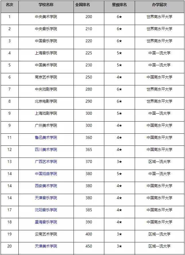 中央戲劇學(xué)院、北京電影學(xué)院、中國(guó)音樂(lè)學(xué)院、中央美術(shù)學(xué)院、中央音樂(lè)學(xué)院等榮膺2020中國(guó)六星級(jí)大學(xué)(6★)美譽(yù),躋身世界高水平大學(xué)、中國(guó)頂尖大學(xué)行列。